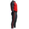 The rich red torso, solid black sleeves, and striped charcoal pants create a dynamic visual that commands attention. This high-impact color scheme boosts team spirit and strikes fear into the competition.